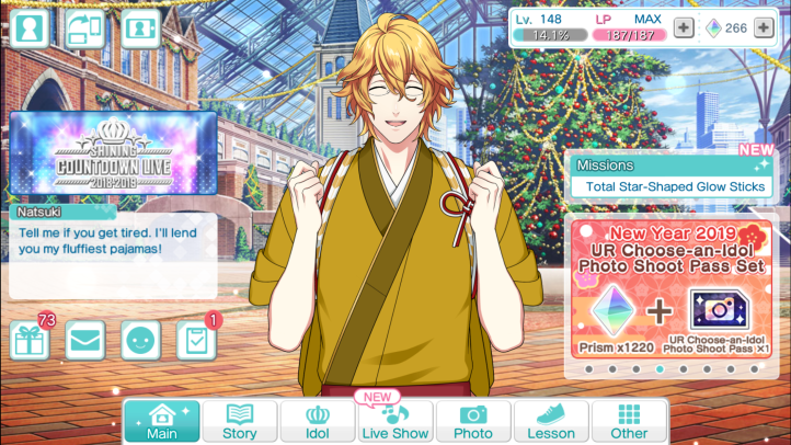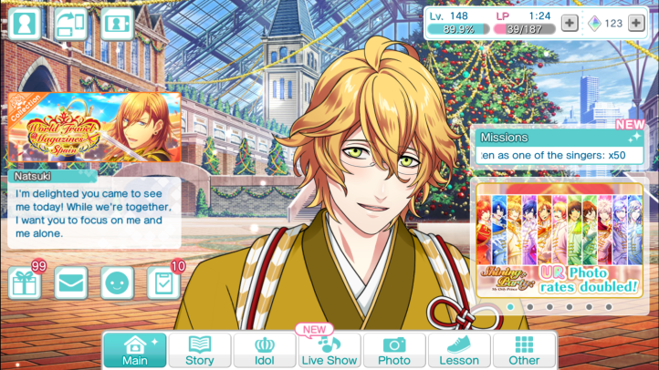 Part of the reason I’m posting this is that I said I’d go on about this at some point. The other reason is that this week there’s another Natsuki event and I’m at a loss. The card reward is too cute and I want only the best of that boy. He says the nicest things. I’ve taken so many screenshots of things he says to me when I interact with him on the main screen.
